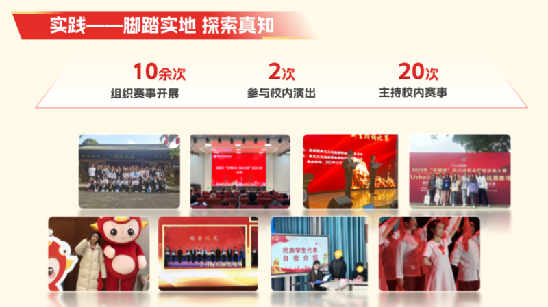 在校期间主持校内活动20余场,组织开展活动10余次,累计覆盖人数1000人。