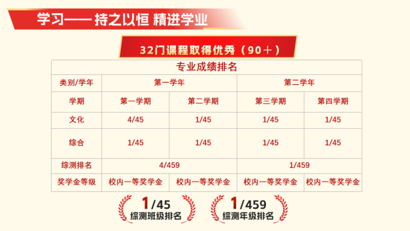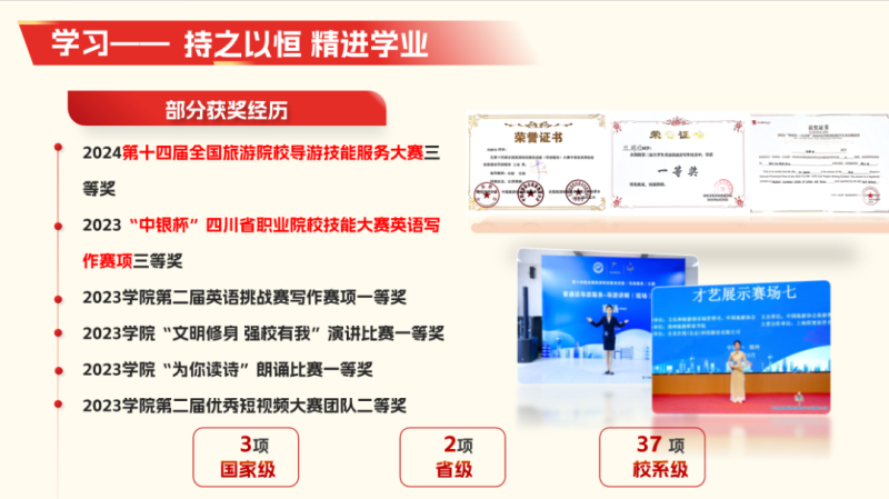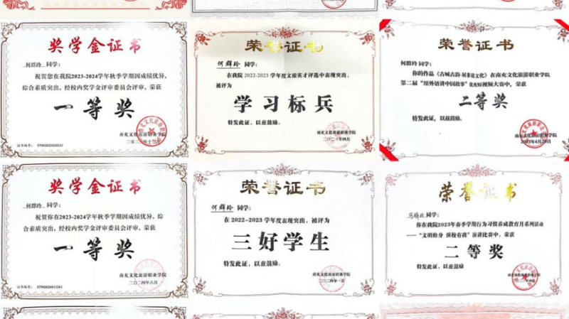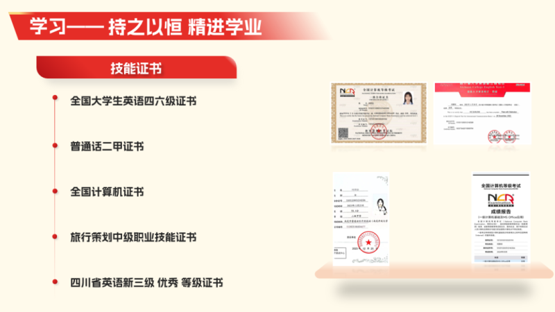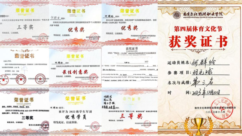 在校期间考取了全国大学英语四六级证书,计算机二级证书,普通话二级甲等证书,1+x旅行策划中级证书。获得荣誉累计42项。