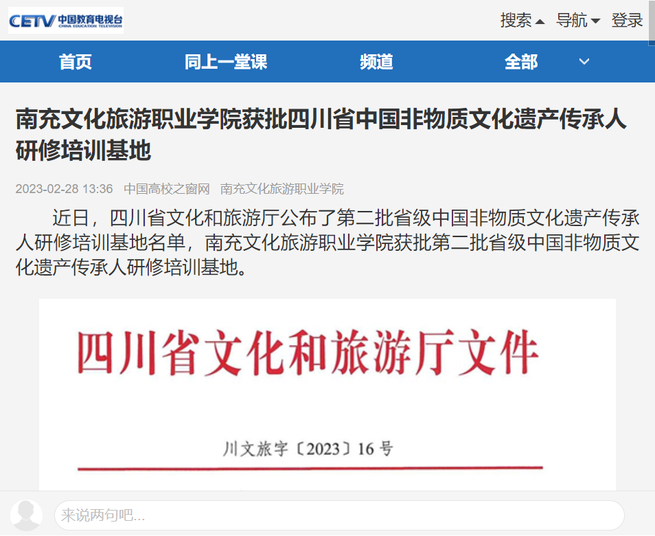【中国高校之窗网】南充文化旅游职业学院获批四川省中国非物质文化遗产传承人研修培训基地