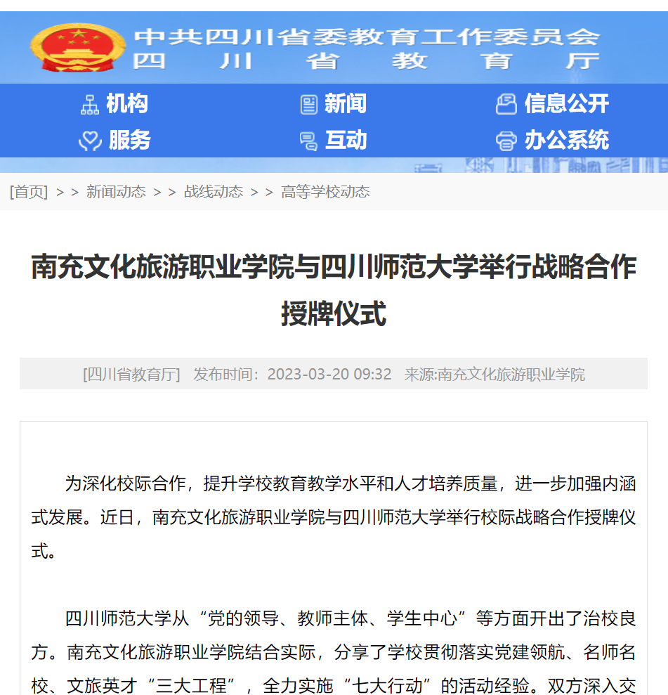 【四川省教育厅】南充文化旅游职业学院与四川师范大学举行战略合作授牌仪式