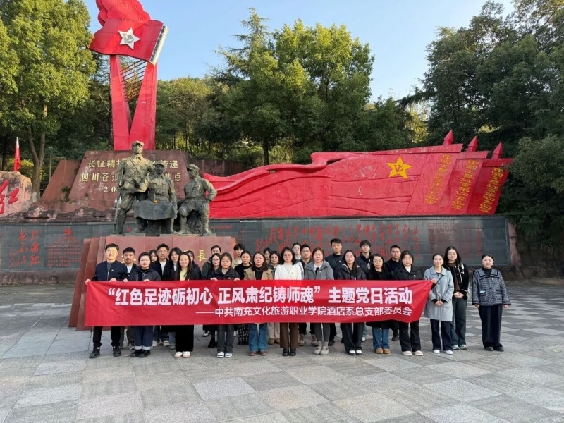 为深入学习贯彻习近平新时代中国特色社会主义思想,将理论武装与红色实践相结合,推进教师队伍建设、筑牢育人思想根基,11月26日下午,酒店系党总支组织全体党员、学生入党积极分子代表,赴苍溪红军渡纪念馆开展“红色足迹砺初心 正风肃纪铸师魂”主题党日活动。